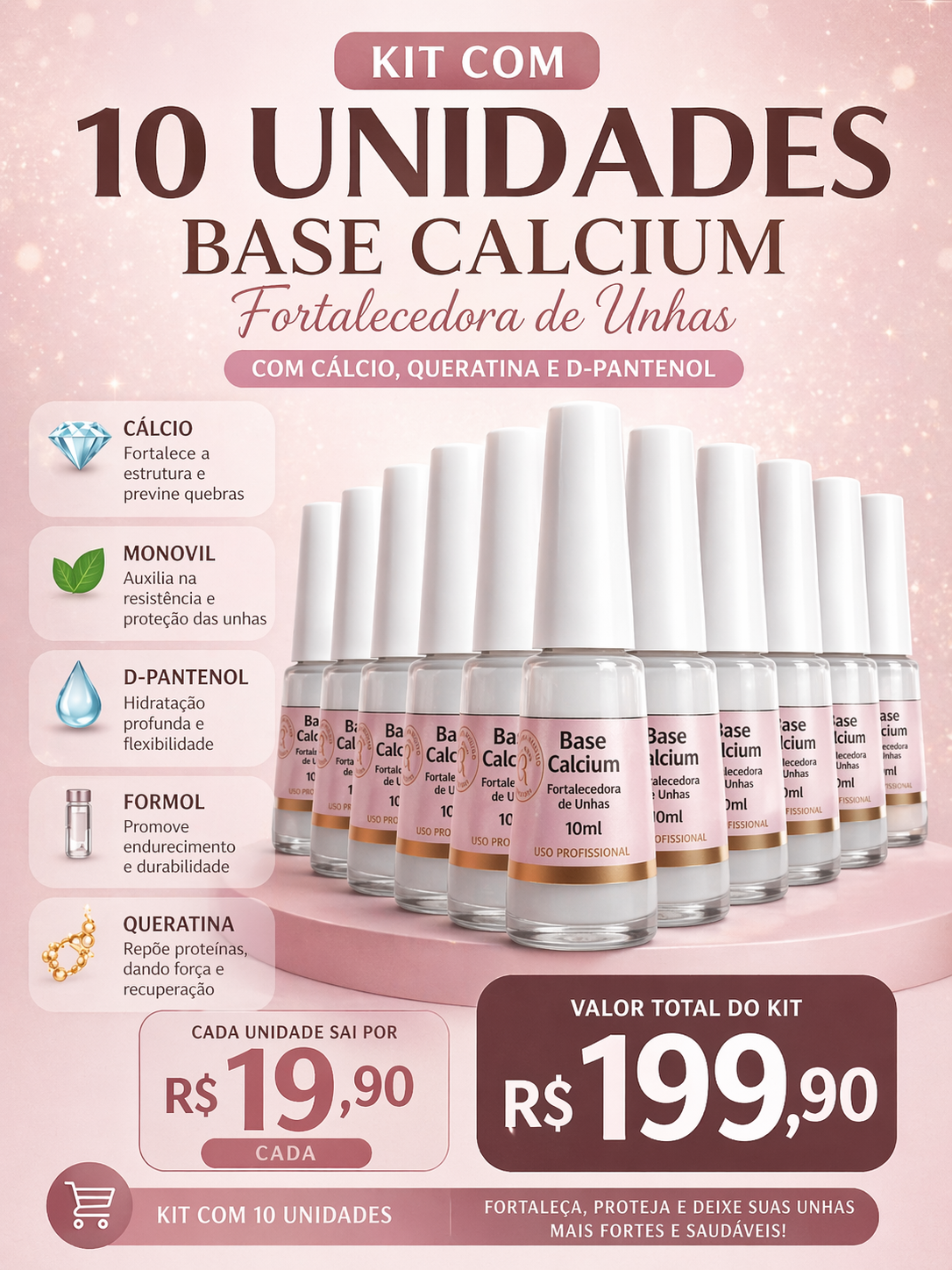 A Base Calcium é uma solução fortalecedora desenvolvida para restaurar a resistência das unhas, promovendo crescimento saudável, proteção e durabilidade.