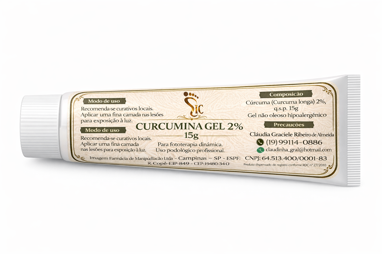 Gel especialmente formulado com 2% de cúrcuma, focado em tratamentos de fototerapia dinâmica no cuidado podológico.
