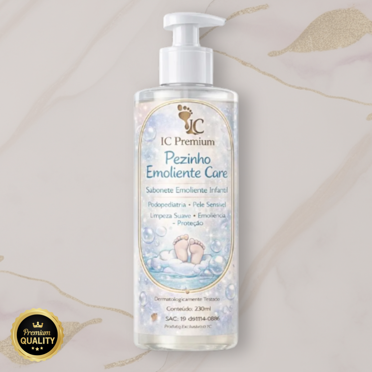 O Pezinho Emoliente Care IC Premium é um sabonete emoliente infantil, desenvolvido para promover a higiene suave dos pés sensíveis das crianças, respeitando a delicadeza da pele infantil.